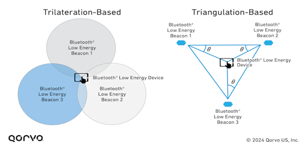 Launched in 2004, BLE is a key part of the IoT ecosystem, known for its low power use, 40-channel data transmission in the 2.4GHz band, and mesh networking. BLE positioning relies on beacons and two main techniques: Trilateration and Triangulation. Trilateration, the most common, uses at least two beacons and measures distance via the Receive Signal Strength Indicator (RSSI). Triangulation uses two or three beacons, with known distances between them, and measures Angle-of-Attack (AoA) or Angle-of-Departure (AoD) to determine distance and direction.