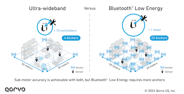 UWB outperforms BLE in typical line-of-sight (LOS) conditions and requires fewer anchors (Figure 6) than BLE for the same coverage, reducing infrastructure, deployment, and maintenance costs. While Bluetooth LE CS can improve accuracy and range, there’s a trade-off between the two, with sub-meter accuracy limited to shorter distances. Accuracy will typically degrade at the edge of the coverage area, especially in multipath environments.