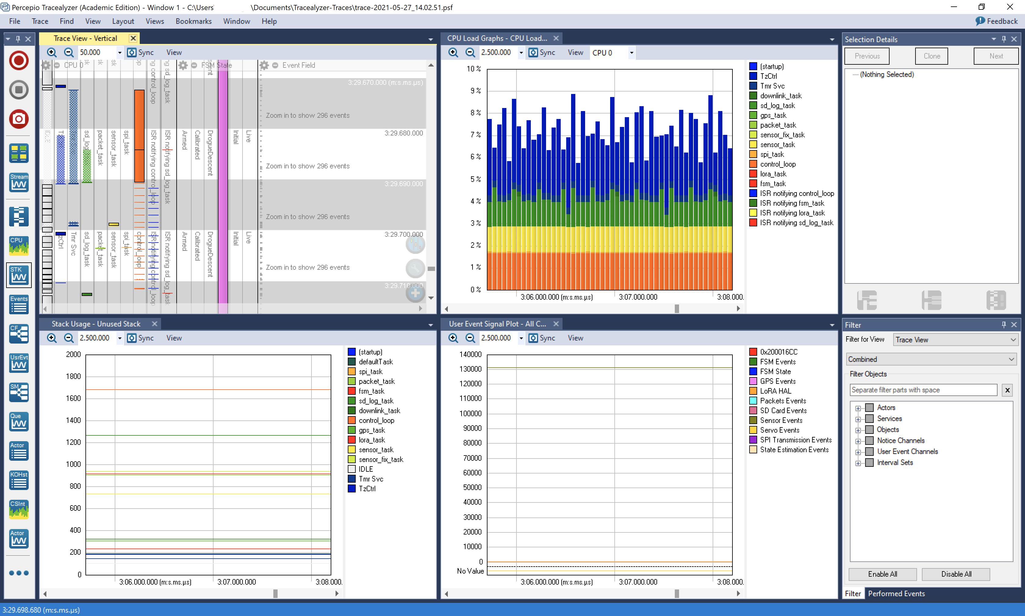 First, the team (embarrassingly) noticed that FPU (floating-point unit) support wasn’t activated in FreeRTOS’ configuration, which immediately boosted the performance. After that, using Tracealyzer allowed us to do “rapid prototyping” on the generated code to quantify what exact effect different generation options had on the code’s performance. In the end, the team could single down on the tradeoff between RAM usage and performance that proved optimal for the team’s purposes, and could achieve the desired sampling rate.