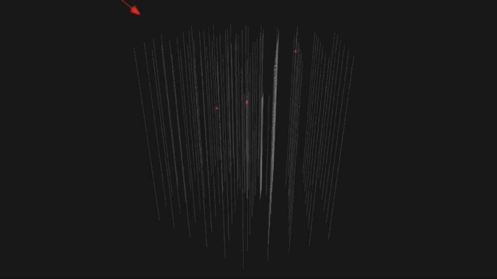 When a muon neutrino interacts in IceCube, it creates a muon that travels through the detector array and leaves a track of light behind it. ANIMATION: ICECUBE COLLABORATION