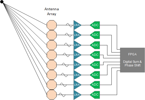 In an analog beamforming system (see Figure 1), a component called a phase shifter controls the time delay electronically. Digital beam steering systems (see Figure 2) implement the time delay in the processor. Individual data converters performing digital beam steering digitise the information to or from each antenna, which increases the number of components, which then affects system size, weight, power, and cost (SWaP-C).