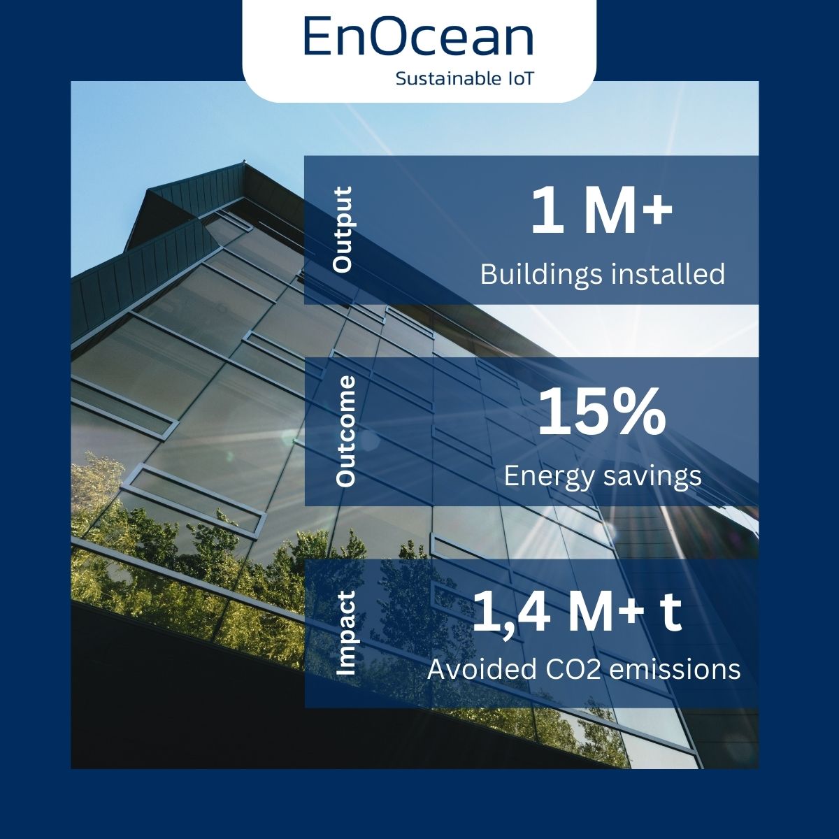 Now having a large installed base of EnOcean technology, the CO2 impact can be assessed, and it is significant. EnOcean has developed a calculator, leveraging commonly used references, to quantify the savings in energy and, from this, the savings in generated CO2 achieved through EnOcean units controlling HVAC and small electrical power in buildings. More than 1 million buildings are now installed worldwide with EnOcean technology, in smart homes and commercial buildings. Overall, EnOcean is managing about 221 million square metres of smart-building floorspace. Based on official references for the energy demands of HVAC and small electrical power systems, these devices are currently saving 15% energy on average and by that more than 1.4 million tons of CO2 from the atmosphere, every year! And as more sensors are continuously installed, the annual savings will continue to increase.