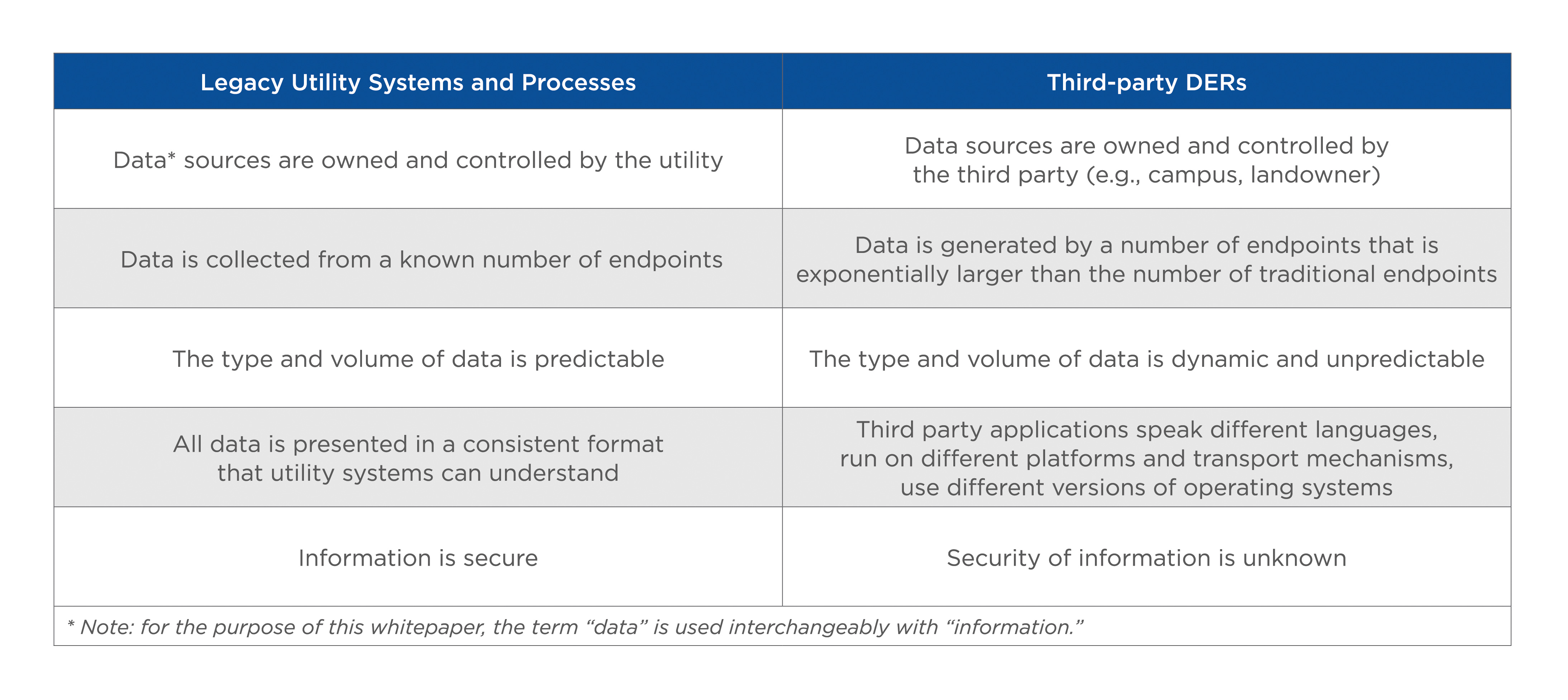 Integrating data provided from DERs into decades-old legacy systems presents numerous technical challenges. As shown in Table 1, DERs are largely incompatible with traditional utility systems and processes. If utilities can manage or neutralise these differences, all of the necessary information can be visible. Gaining visibility is the first step to convert DER data into actionable information.