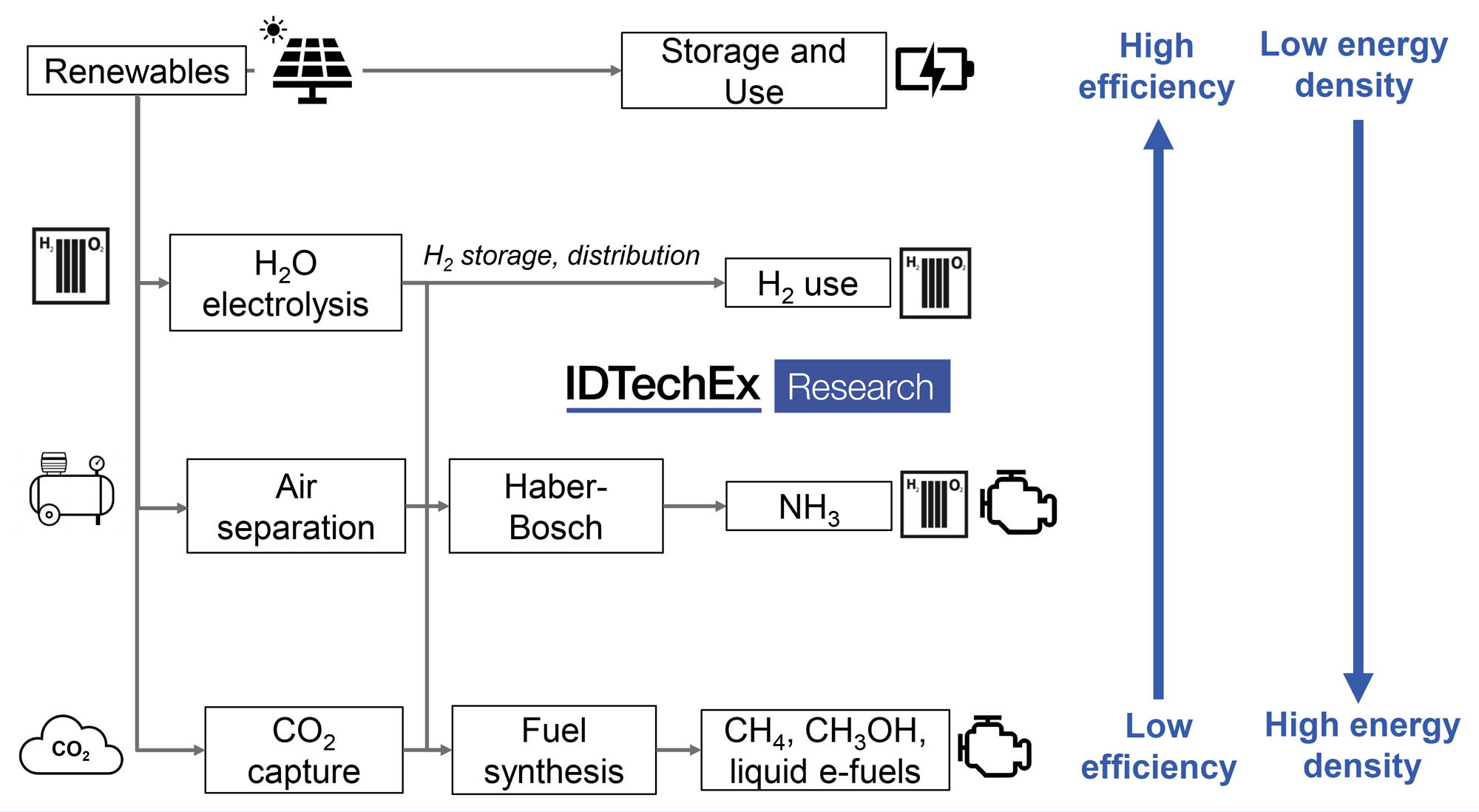 Conversion from hydrogen to fuels such as methane or liquid fuels will be beneficial by allowing easier transport and distribution and their ability to act as a drop-in replacements to current fossil fuels. However, e-fuel synthesis presents additional process steps and energy consumption requirements, resulting in high capital costs and inefficient use of input energy compared to the direct use of electrical power, in addition to the relatively low efficiency of the fuel combustion itself e.g., an ICE will be only 20 to 30% efficient compared to a battery at >90% or a fuel cell, which can operate at efficiencies above 60%.