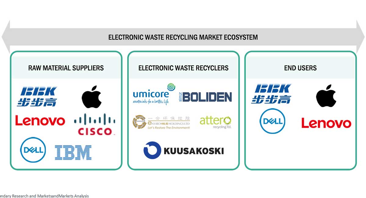Ecosystem mapping for the electronic waste recycling market involves identifying and analysing interconnected relationships among various stakeholders, including raw material suppliers, recyclers, distributors, contractors, and end users. This mapping delineates the flow of resources, information, and value within the ecosystem, highlighting dependencies, collaborations, and potential disruptions. Raw material suppliers are crucial in providing key materials, while electronic waste recyclers recycle the electronic waste to extract valuable materials and supply them to the end users for their operations. Distributors facilitate the supply chain by delivering products directly to retailers or end users using recycled materials for metal manufacturing, chemical manufacturing, food & beverage industry, and the medical and healthcare industries.