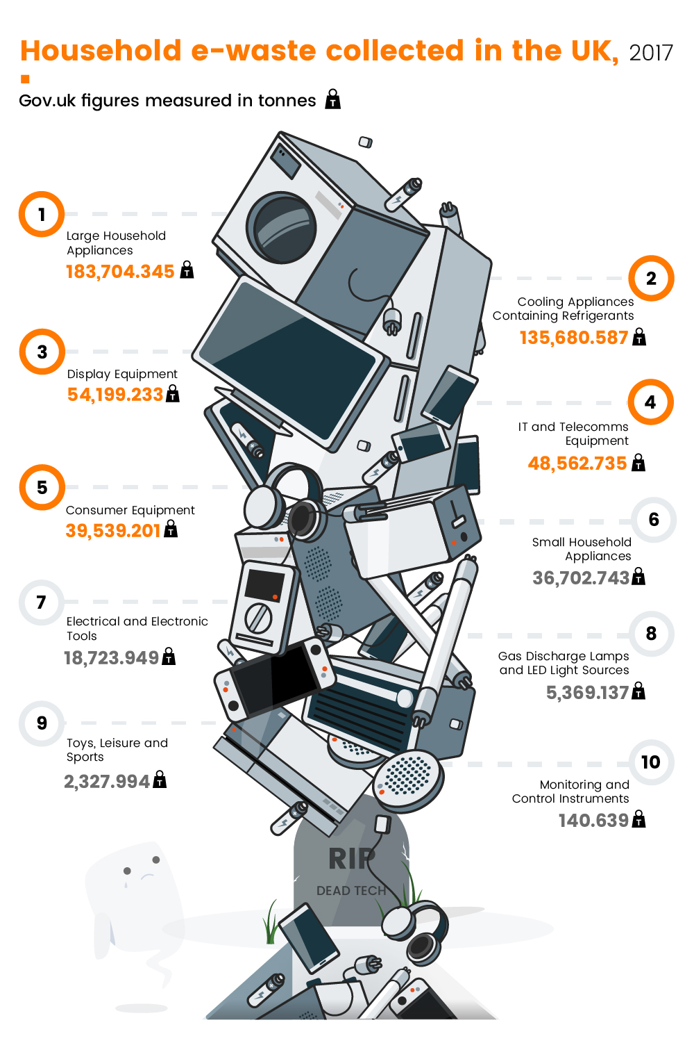 Electronic waste – or ‘e-waste’ – refers to all items of electrical and electronic equipment and its parts that have been discarded by its owner as waste without the intent of reuse. Concerned that the amount of e-waste generated is expected to increase substantially over the next few decades, OnRecycle.co.uk delved deeper into the issue. They analysed 2018 data released by Gov.uk, concerning Waste Electrical and Electronic Equipment, which outlines the household e-waste collected in the UK throughout 2017.