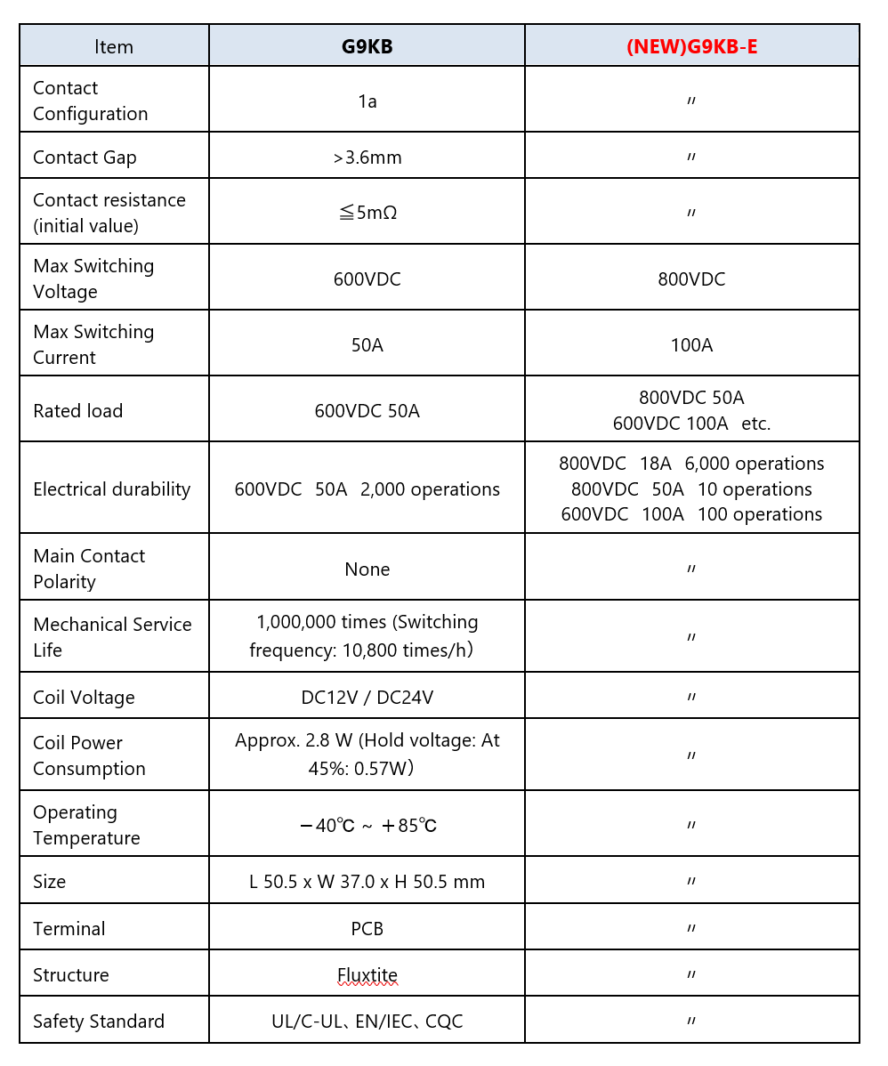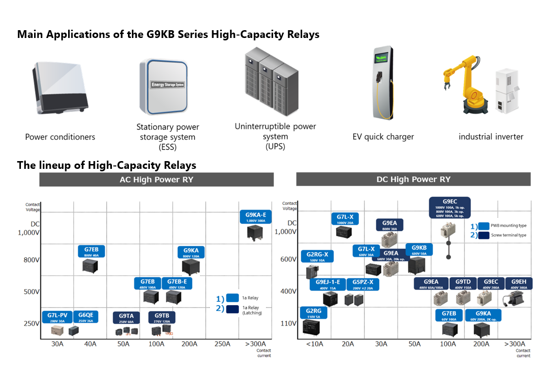The G9KB-E is a high-capacity version of the G9KB series, which has the same size and weight as the G9KB reference model, but with a maximum opening and closing voltage of 800V DC and a maximum current of 100A. The rated value of 800V DC 50 A and 600 V DC 100A is especially suitable for 15~40kW class battery related applications such as power storage systems and EV charger/V2X.