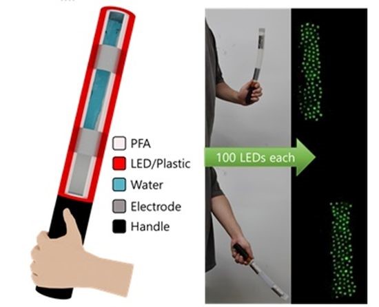 The researchers tested different designs, changing the size and ratio of the electrodes, the physical space between the electrodes and the amount of water in order to determine the optimal combination. They found that the portable stick generator could generate a high electrical output reaching 710 volts when it had adequate space for water movement and a high electrode area. The researchers showed that the generator can power 100 LED lights, meaning it could be used as a traffic safety light baton that illuminates when shaken.