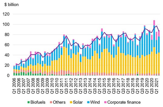 New equity raised on public markets hit a record high at $28.2bn in 1H 2021, as did venture capital and private equity commitments to renewable energy companies at $5.7bn. These were major contributors to the strong overall first half. At the same time, investment in solar projects was up 9% year-on-year. Wind asset finance, however, fell year-on-year, as it stands in contrast to 1H 2020, which was a bumper period for financings of major offshore wind farms.