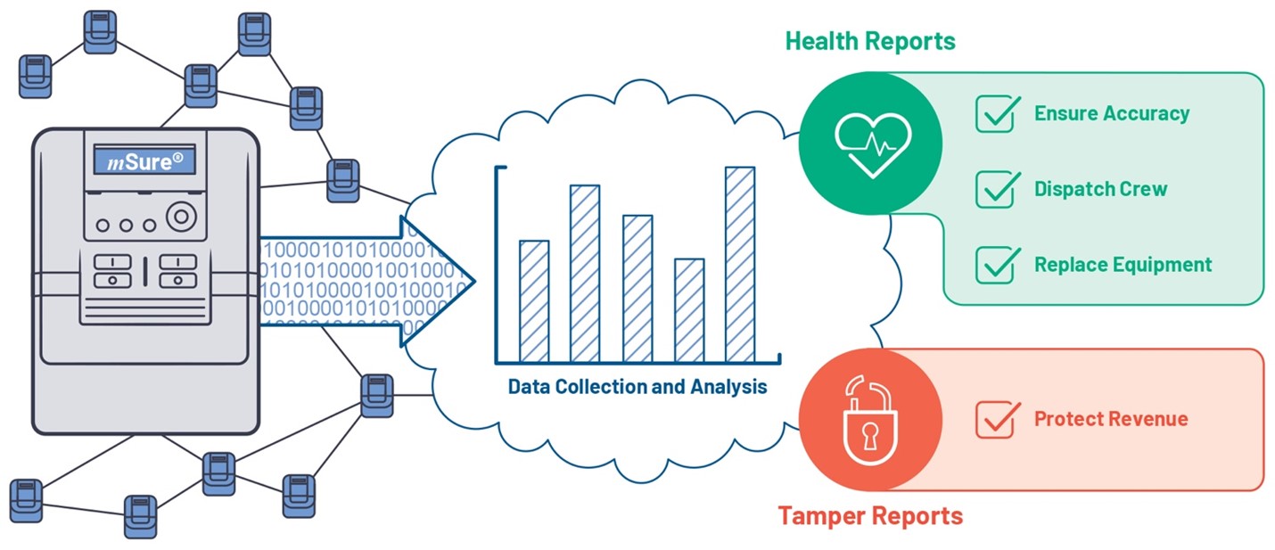 Figure 2. mSure-enabled meters send diagnostic data to an analytics service that produces reports, alerts, and insights.