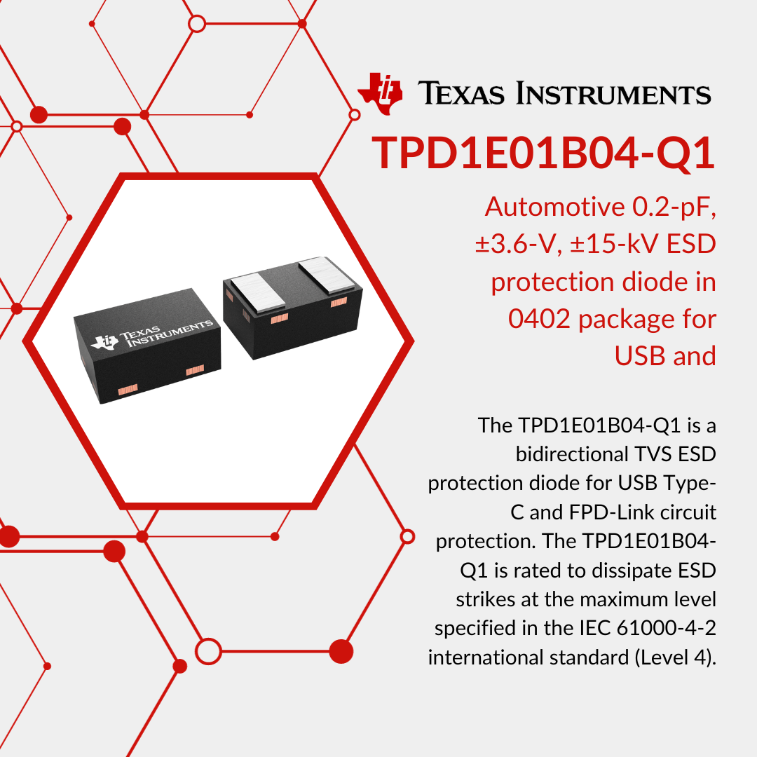 The TPD1E01B04-Q1 is a bidirectional TVS ESD protection diode for USB Type-C and FPD-Link circuit protection. The TPD1E01B04-Q1 is rated to dissipate ESD strikes at the maximum level specified in the IEC 61000-4-2 international standard (Level 4).