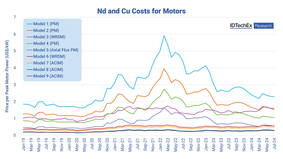 The price of magnets and copper in EV motors have been susceptible to significant volatility, but magnet free designs are more stable. Source: IDTechEx