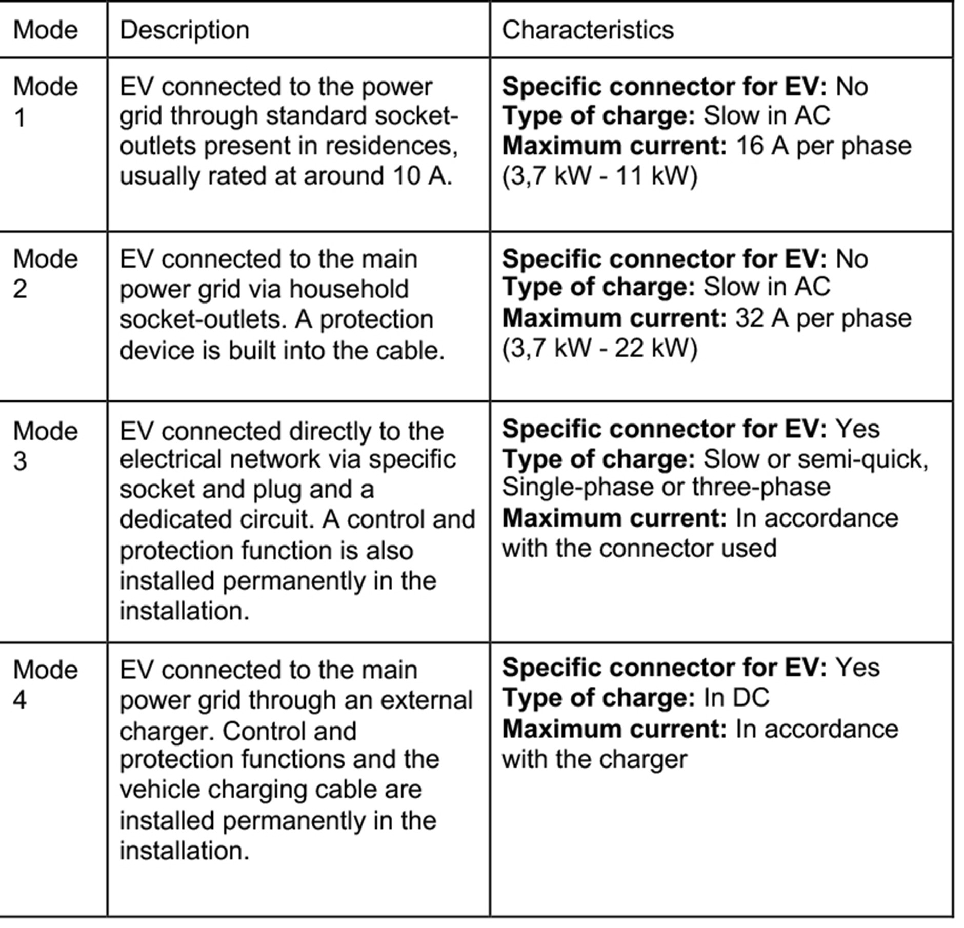 Table 1: IEC 61851-1 defines 4 modes of EV charging