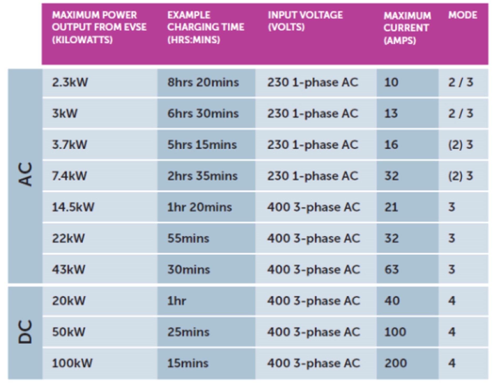Table 2 shows the theoretical times to charge a 24 kWh battery to 80%, using different power levels.