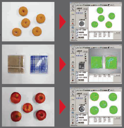 This enhances picking, presence recognition, and high-speed counting of multiple workpieces. Blob detection is especially effective when the objects are irregular shapes such as foodstuffs and clothing, and hence expands the possible range of applications for robot vision.