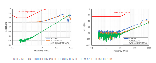 The ACT1210E series of common mode chokes/filters from TDK is the industry’s first for automotive Ethernet 10BASE-T1S. These devices use TDK’s proprietary wire winding structure and optimal materials to achieve industry-leading S-parameter values (Figure 2).
