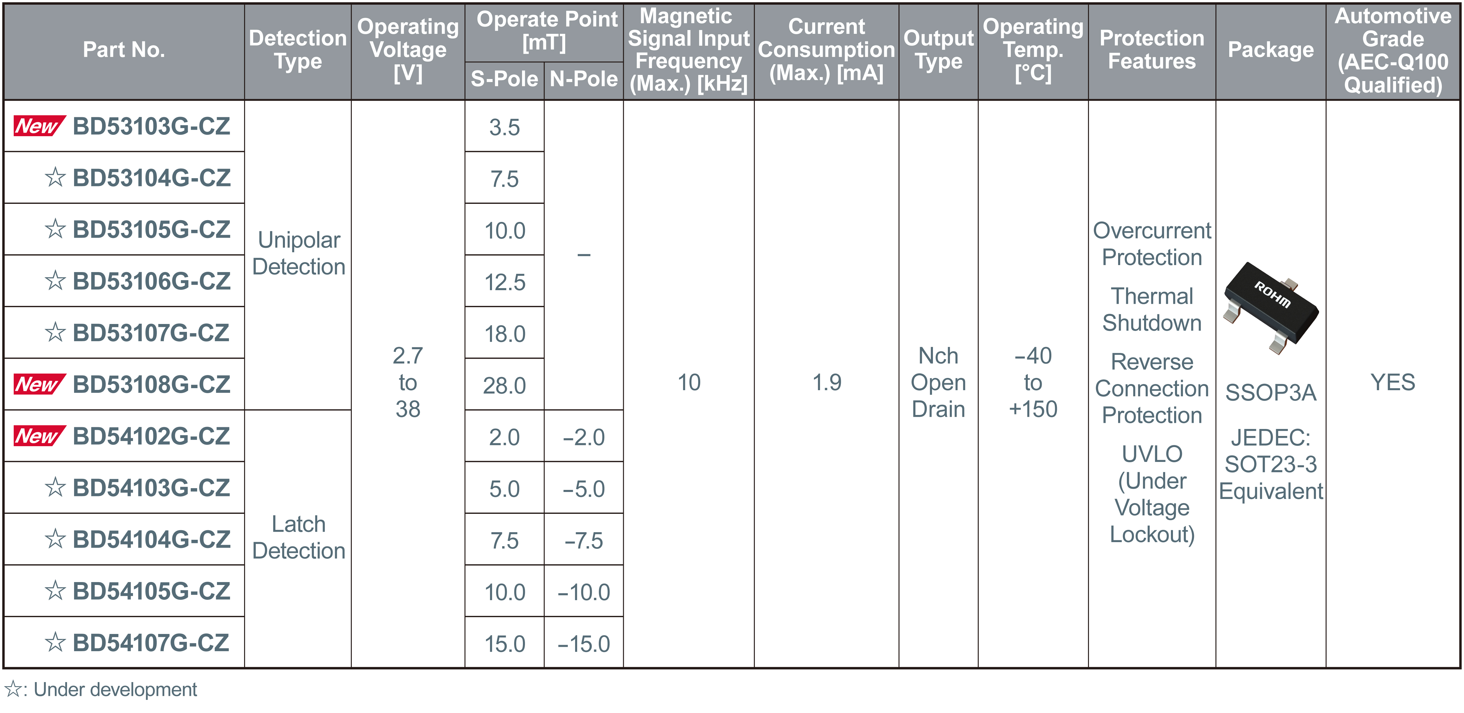 ROHM has developed Hall ICs, the BD5310xG-CZ / BD5410xG-CZ series, designed for automotive applications requiring magnetic detection.