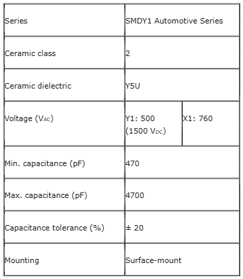 Combining their Y1 rating of 500VAC and 1500VDC with high capacitance to 4.7nF, the Vishay BCcomponents SMDY1 automotive series devices are designed to provide EMI/RFI suppression and filtering in harsh, high humidity environments.