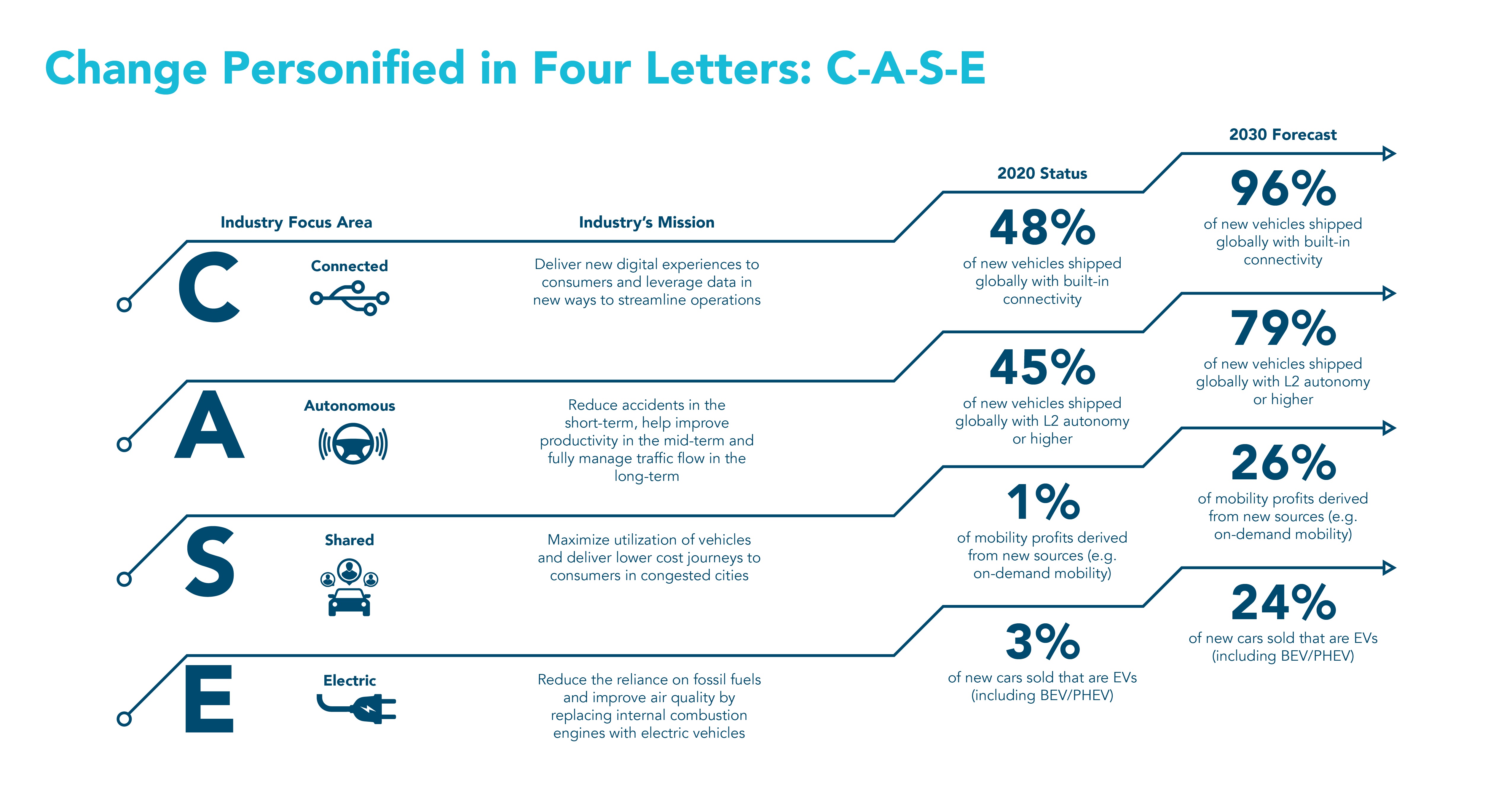 As the consumer values like the sharing economy and sustainability continue to take hold, SBD Automotive estimates that 26% of mobility profits will be derived from new sources such as on-demand mobility, while 24% of all new cars sold by 2030 will be electric.