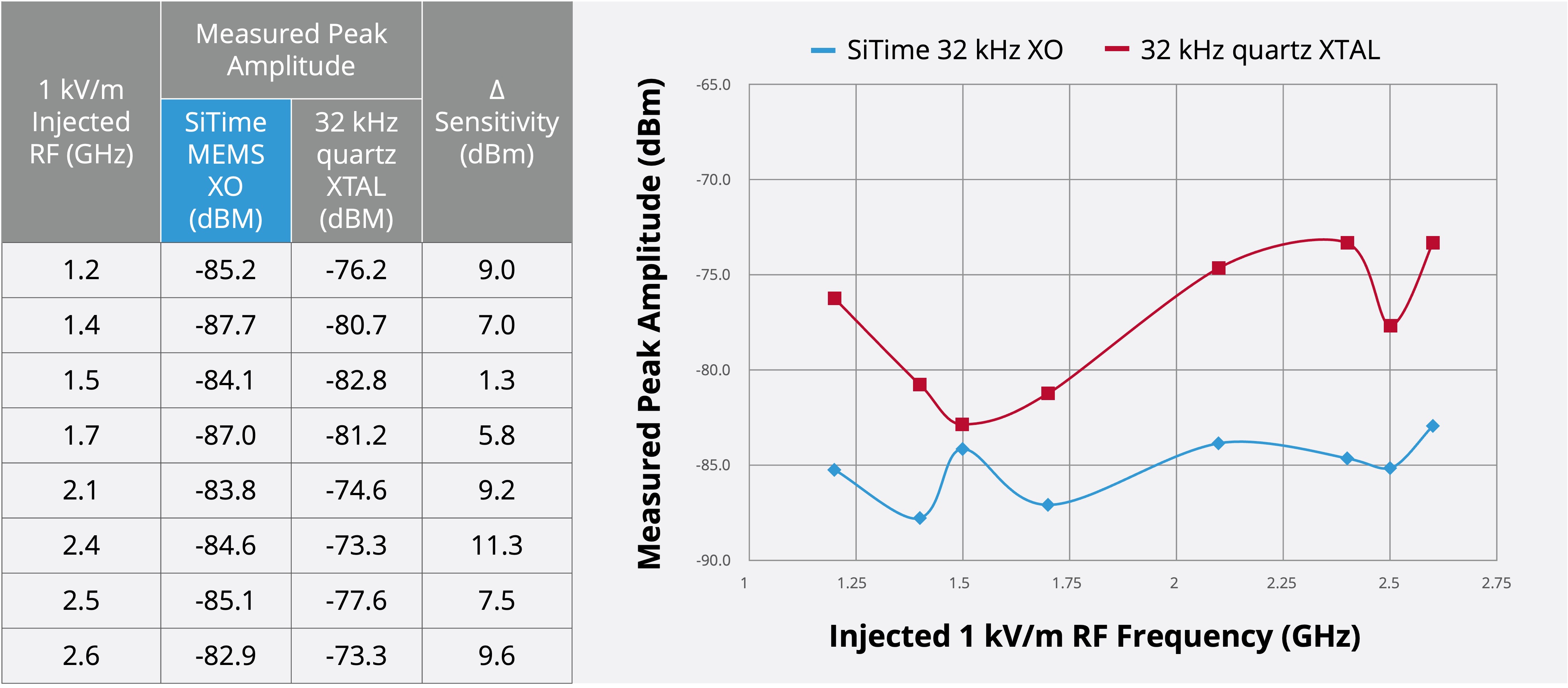 Figure 2: SiTime’s MEMS oscillator remains resilient to EMI compared with a quartz-based alternative. This test was performed per IEC 62132-2 standard that injects electromagnetic energy into a transverse electromagnetic (TEM) cell where the device under test (DUT) is mounted.