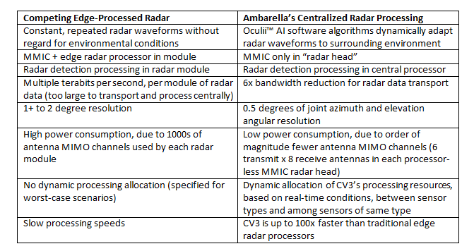 The data sets of competing 4D imaging radar technologies are too large to transport and process centrally. They generate multiple terabits per second of data per module, while consuming more than 20W of power per radar module, due to thousands of MIMO antennas used by each module to provide the high angular resolution required for 4D imaging radar. That is multiplied across the six or more radar modules required to cover a vehicle, making central processing impractical for other radar technologies, which must process radar data across thousands of antennas.