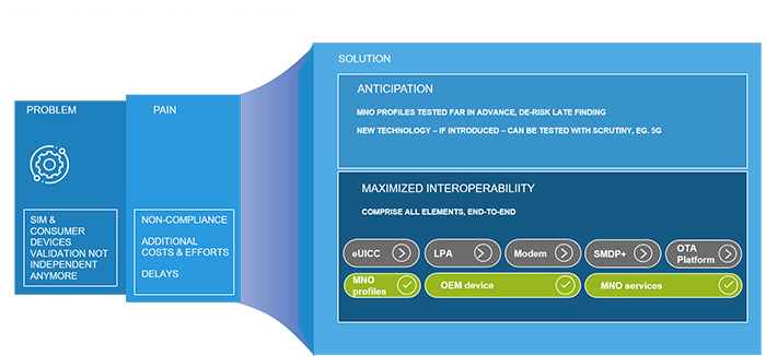 For years plastic SIMs and devices have been independently developed and commercially deployed. eSIMs require a new approach. OEMs run their design schedules long before an MNO expects to see Technical Acceptance (TA) of the device. In consequence, the eUICC tests and design is finished before the MNO testing even started, carrying the risk of a misalignment in features and the service roadmap next to a number of unanticipated issues for both MNOs and OEMs. If the eSIM will only get tested once the MNOs enter the Device TA phase, there is a high likelihood that trouble spots will arise, including: