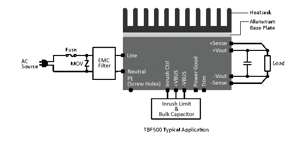 TBF500 series has a universal input voltage range of 85-264Vac. The output voltages are 12, 15, 24, 28, 48, and 54VDC and are adjustable by external resistors in the range of +10%/ -10%, The use of the remote sense pins compensate the voltage drop over the PCB tracks for an accurate working voltage at the point of load. The full protection functions include over-current protection (hiccup mode), short-circuit protection (automatic recovery), and output over-voltage protection (latch-off).