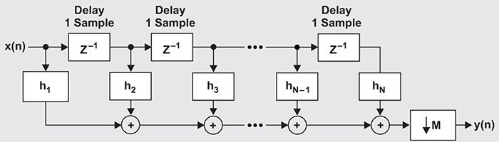 Figure 3 shows a generic FIR implementation. In a half-band implementation with seven taps/coefficients (N = 7), all even taps (h2, h6) except h4 are zero, which reduces seven multiplications to five. For higher decimation rates, halfband filters are concatenated.
