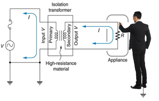 Safety: To prevent current surges from damaging equipment and protect humans from the main power source. Figure 1 illustrates a power system with the main power source isolated from the secondary side, where a human operator can have physical contact with it. Without proper safety isolation, a lightning strike could send a very high voltage surge through the equipment to the operator and ground. This is mostly lethal. The isolation barrier here routes the dangerous surge energy back to the primary ground, thus avoiding it passing through the operator.