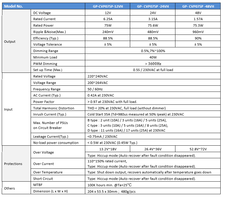 The rated power output is 75W, and DC outputs are available in 12V, 24V, and 48V models. At full load these drivers provide the outstanding power factor correction which greater than 0.97 at 230VAC. The power efficiency of GP-CVP075P-xxVH-T02 can reach 90% and no-load power consumption < 0.5W at 230VAC. The set up time less than 0.5S at 230VAC full load.