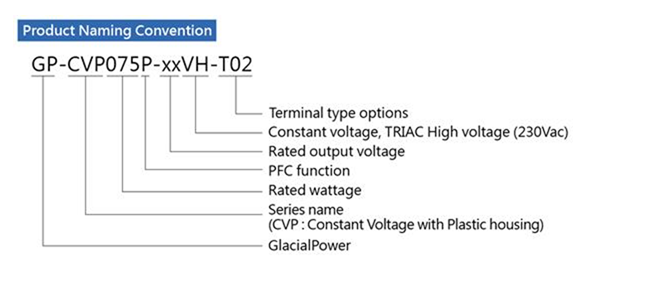 GP-CVP075P-xxVH-T02 series support AC input voltage range from 200 to 264VAC. The GP-CVP075P-xxVH-T02 series can cover most of market demands for LED strip, neon flex, signage, and light box markets. The GP-CVP075P-xxVH-T02 series include the protection functions of over current protection (OCP), short circuit protection (SCP), over temperature protection (OTP), and over voltage protection (OVP). These features protect the LED driver and lighting fixture to prevent the product’s damage and ensure the reliability.