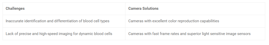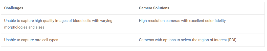 Peripheral blood smear analysis is a diagnostic technique that examines a thin layer of blood cells spread on a glass slide. It is a valuable tool in haematological investigations and allows for evaluating various blood cell types, their morphology, and any abnormalities present. Here’s a summary of the camera solutions for the challenges faced in peripheral blood smear imaging: