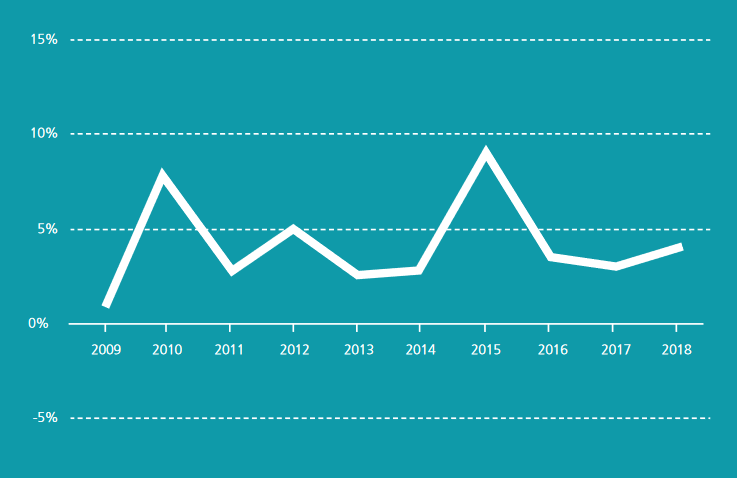 Figure 2: European medical device market growth rates 2009-2018 : The European medical device market has been growing on average by 4.2% per annum over the past 10 years. Demand fell in 2009 due to the economic crisis, resulting in a growth rate of only 1%. The market recovered in 2010, since then the annual growth rate has varied between 2.6 and 9.3% in the European medical device market. Source MedTech Europe