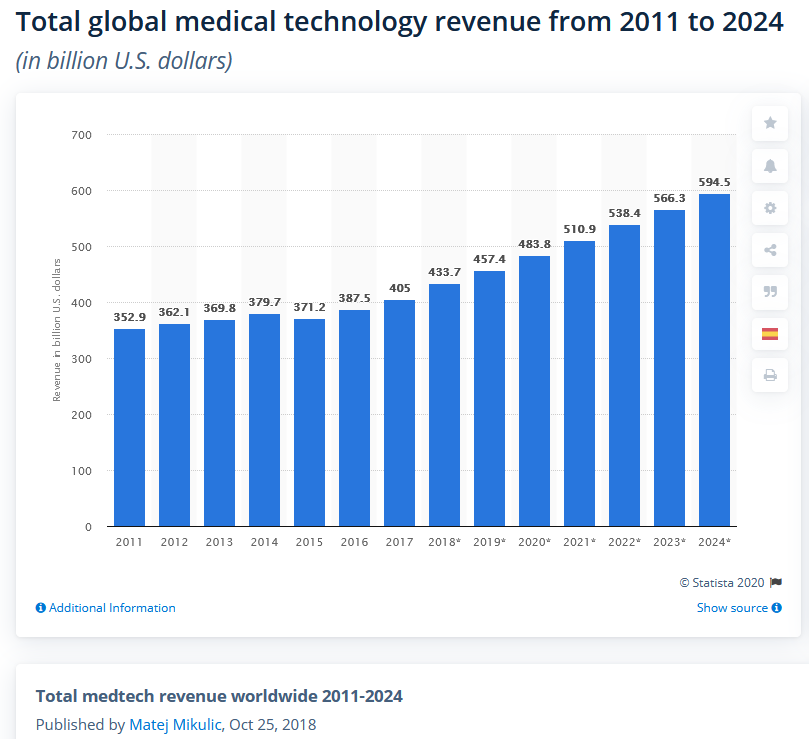 According to surveys by the Statista Research Department, leading global medical technology companies generated total sales of around 434 billion US dollars in 2018. Nearly 40 percent of global production is located in the USA, where six of the ten leading medical technology companies are based according to the study. GTAI – Germany Trade & Invest (the business development agency of the Federal Republic of Germany) rates the British market for medical technology as the sixth largest medical technology market in the world and the third largest in Europe (after Germany and France).