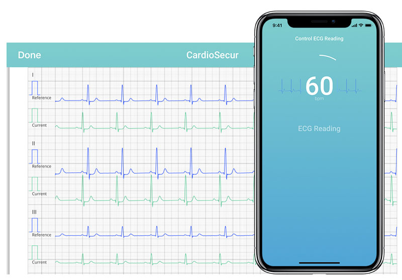 CardioSecur is an approved diagnostic 15-lead ECG app, which takes only 30 seconds to perform. Its 50g ultra-light cable conclusively detects not only all types of arrhythmias (incl. A.Fib), but also critical life-threatening circulatory disorders such as heart attack.
