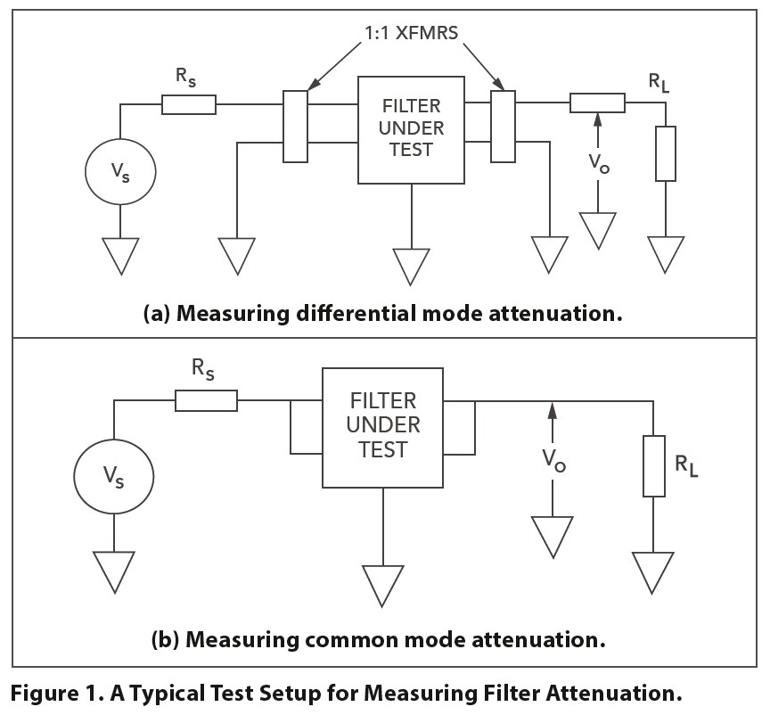 Filters should not be expected to provide voltage regulation, clamping or smoothing. The value of inductive reactance should be kept small to prevent excessive distortion of the power frequency. The maximum value of line-to-line capaci­tance (differential mode) reactance should be no less than 100 times the filtered device’s input impedance. These two simple rules will help avoid power frequency issues such as voltage drop or waveform distortion. Test the filter for both common mode and differential mode attenuation. Adequate differen­tial mode and common mode filtering must fit the potential problem (see Figure 1). As any filter schematic is only an approximation of the filter circuit especially at higher frequencies, in real life the filter components exhibit toler­ance, saturation, and parasitics as well as coupling.