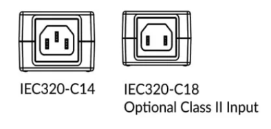 Figure 4. Class I (left) and Class II (right) units have grounded three-wire or ungrounded two-wire AC line connections, often used with standard IEC receptacles and user-supplied line cords. (Image source: XP Power)