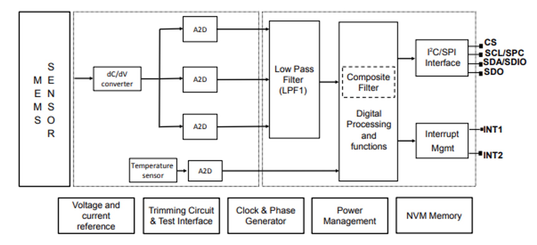 The analogue capacitance measurements of each axis are measured and converted into digital values. After some digital signal processing techniques, the data is available for communication to the host processor via the I2C serial interface. All of the required sensor functions become integrated inside an application-specific integrated circuit (ASIC), which, together with the MEMS element, form a single system-in-package (SiP) IC.
