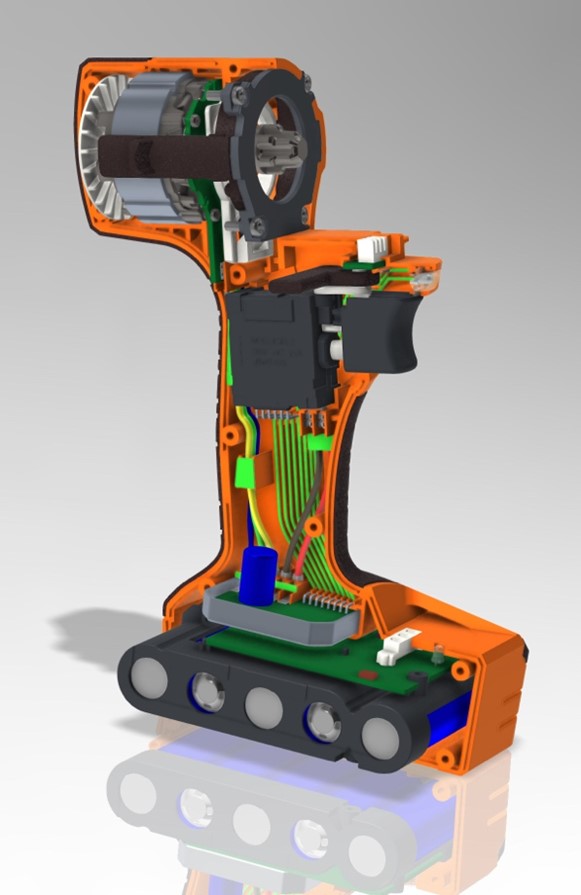 Electrical function integration is equally applicable to the manufacturing of battery-operated hand tools. Clamshell designs, where the wiring is principally in the handle of the tool, are particularly prone to wiring damage during manufacture when the two halves of the casing are brought together. With the wiring automatically affixed, this problem and the other issue described earlier, are eliminated.
