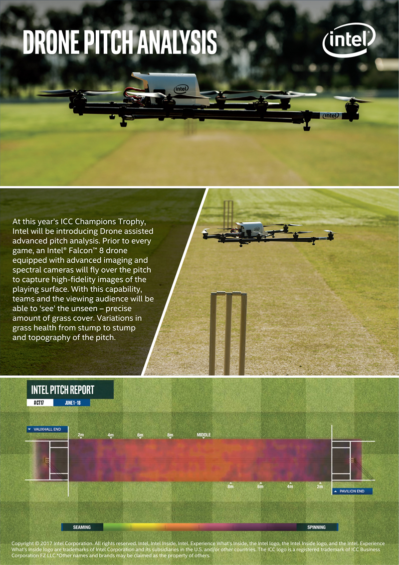 In the Champions Trophy tournament, the Intel Falcon 8 Drone, equipped with high definition and infrared cameras will be used for advanced pitch analysis before every match. Images captured by the drone will offer rich visual data on pitch conditions such as grass cover, grass health and topology, which will be used to generate daily pitch reports leveraged by commentators during broadcasts.