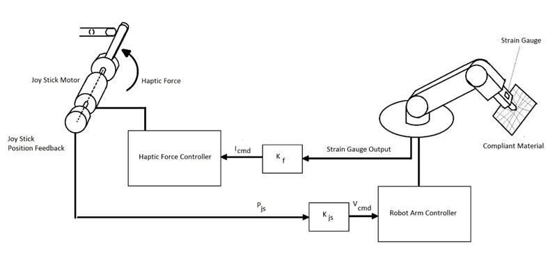In each case, the force signal is then mapped into a desired joystick motor current by the haptic force controller. The motor current creates a torque on the joystick motors which manifests itself as a force felt by the operator.