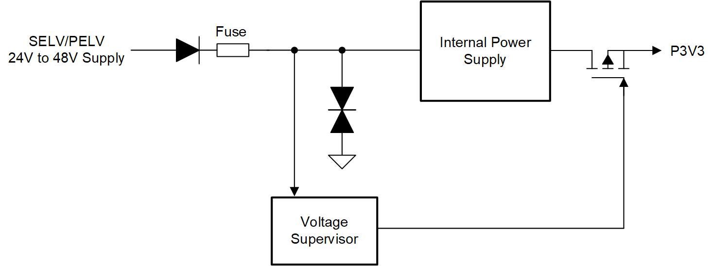 Figure 1. IEC 61800-5-2 implementation of a high-side safe power supply showing power supply and voltage monitoring