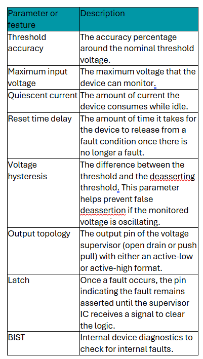 With accurate voltage supervision, you’ll know when to completely shut off a system, reset an MCU, or make another system-level choice to achieve the safe state. There are ways to design a voltage monitoring circuit using discrete components, but in a system focused on functional safety it becomes much easier to determine the diagnostic coverage if the voltage monitoring functionality is integrated into a single subsystem circuit. This is why voltage supervisor ICs are particularly helpful for functional safety: they include different combinations of threshold accuracy, quiescent current, reset time delay, latching capability, voltage hysteresis, output type and BIST. Table 4 lists some parameters and features of voltage supervisors.