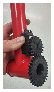 This gear was made in a similar way to above, but with a 2:3 gear ratio. This ratio was chosen because david0429 wanted to make sure the servo had enough power to turn the steering without stalling, and the servo could only turn 180°, but the actual trike didn’t need to turn that sharply.