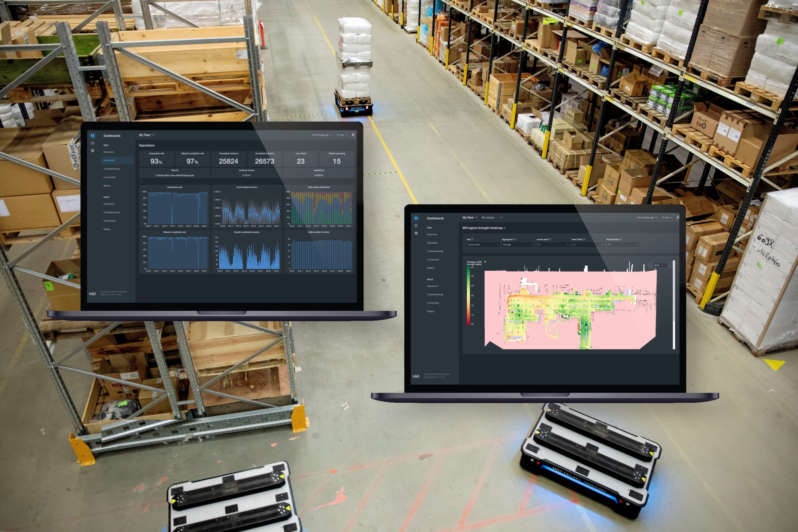 • Data dashboards: Monitors key performance indicators (KPIs) such as distance driven, completed missions, and robot utilisation rate.