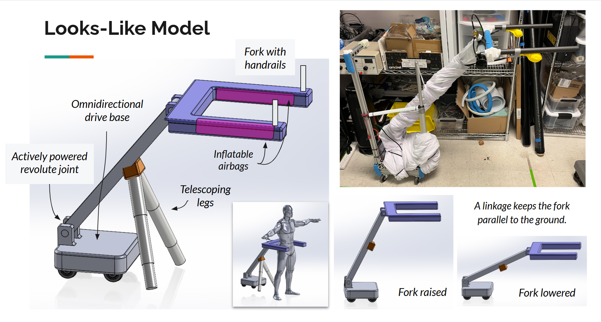 The robot functions as a pair of robotic handlebars that follows a user from behind. It can provide full bodyweight support, assist with transitions between sitting and standing, and automatically deploy side airbags to catch a person in the event of a fall.