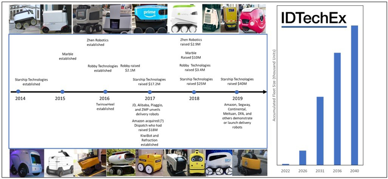 The timeline highlights various key events in the development of the sidewalk delivery business landscape between 2014 and 2019. The chart shows the accumulated fleet size of deployed robots- considering the replacement cycle- between now and 2040.