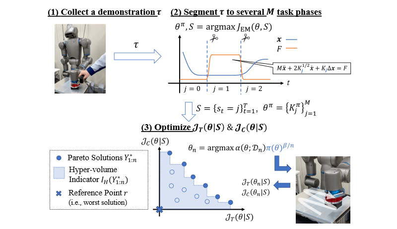 Therefore, as shown in Figure 1, a method was developed that first segments a series of motions being taught to facilitate parameter optimisation, and then finds the optimal impedance gain for each segment using multi-objective Bayesian optimisation.