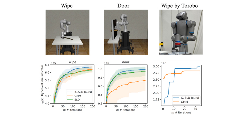 Subsequently, the impedance gain is explored through Bayesian optimisation using prior knowledge. Since IC-SLD also outputs an estimated value of the impedance gain, using this as a solution candidate makes optimisation more efficient. By applying Bayesian optimisation π-BO [Hvarfner+,ICLR2022] that is able to make use of prior knowledge, optimal impedance gains that simultaneously optimise task performance (the cumulative sum of reward functions) and safety indices (the cumulative sum of stiffness parameters) are searched while repeating robot motion trials.