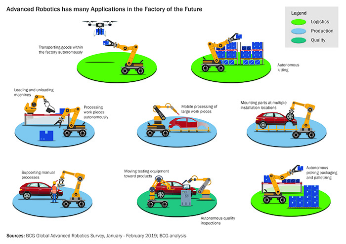 Within a factory there are typically three primary activities; logistics, production and quality. While robots are often thought as being confined to assembly/production tasks, they do have a role to play in all three areas. Based upon a defined bill-of-materials (BoM), robots can kit production jobs ready to be introduced to the production process. Automatic guided vehicles (AGV) can be used to ferry material kits and/or sub-assemblies around the factory, thereby keeping the manufacturing process moving.
